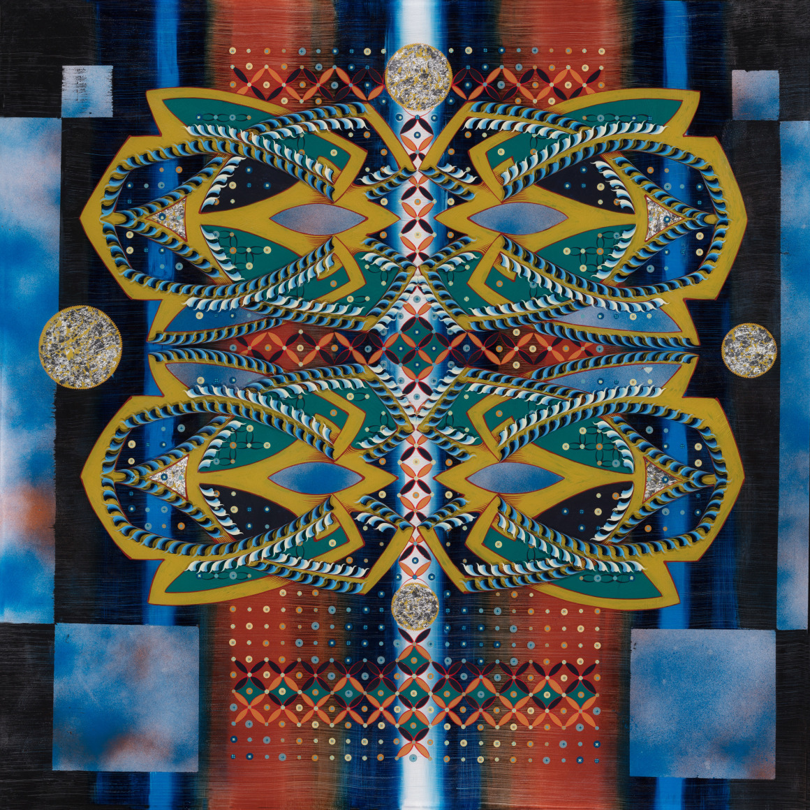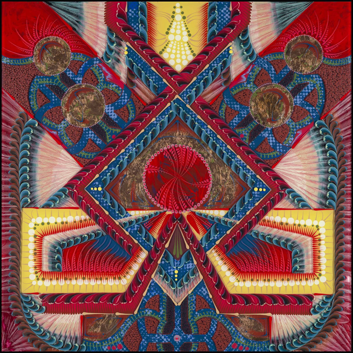 The fractal fabric of her designs are both traditional and mathematical – equally drawing upon accessible rosemaling techniques and complex geometries. It’s tempting to assign cartesian duality to her paintings, but the overall interpretations transcend the physical and the spiritual. They are not a representation of competing dimensions – they are a unified concept of everything.