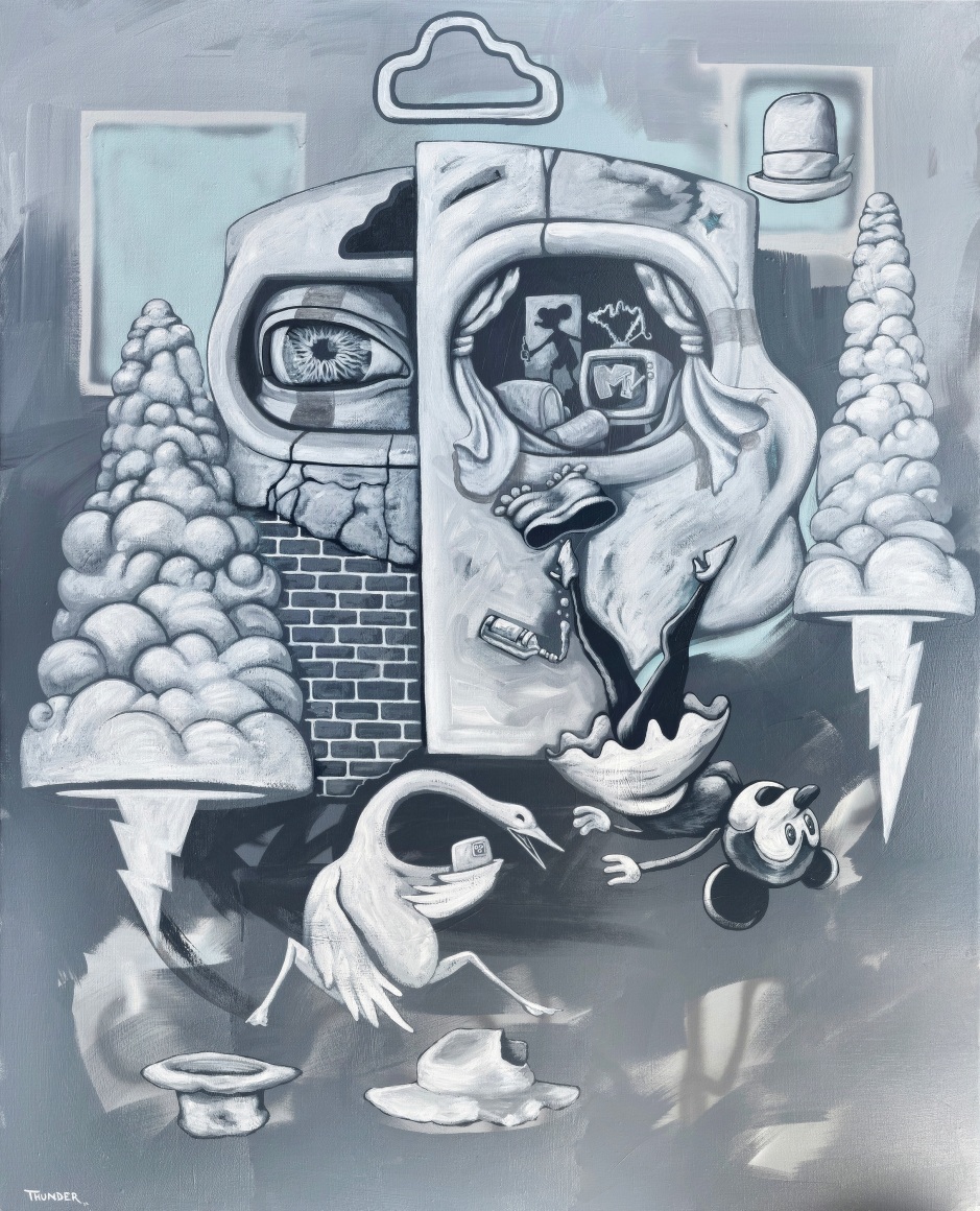 I am also influenced by the culture of my other practice as an animation artist. I wouldn’t consider myself a cartoonist, I feel like each animation I make is a one time film that exists on its own terms. But I have been inspired by the cartoons of my childhood in the 80’s and 90’s. This influence can be seen in paintings like Supernaut and the Pollinators Return to the Skythat somewhat resembles an animated rabbit that I grew up watching on Saturday mornings. I have been able to use my animation practice to create stories with an intent to speak openly about matters important to me and experimental films represent my journey in the form of surrealism. I enjoy merging my painter self with my film maker self to create art that lives and pushes the boundaries of a space. 3D projection mapping and digital canvases are the result of this process. Paint, pixels, light and space allow me to create in a way that makes sense to me.
