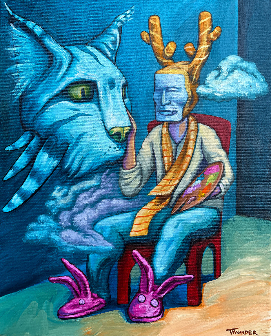 Jonathan Thunder is a multi-disciplinary artist currently residing in greater Minnesota, who works in canvas painting, animation, film making and 3D projection mapping. He has attended the Institute of American Indian Arts in Santa Fe, NM and studied Visual Effects and Motion Graphics in Minneapolis, MN. His work has been featured in many state, regional, and national exhibitions, as well as in local and international publications. Thunder has won several awards for his art/animation work on multiple projects. He is a 2020 Pollock-Krasner Foundation Grant recipient.
