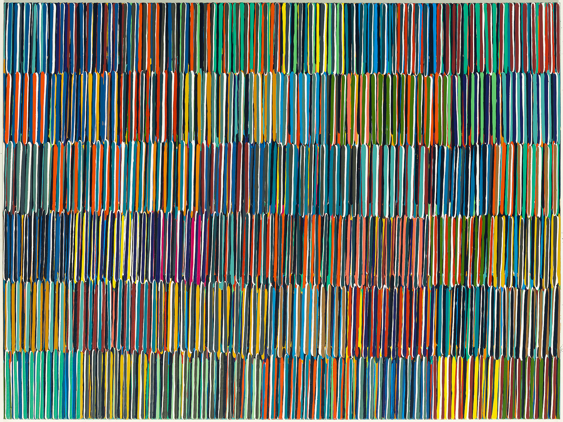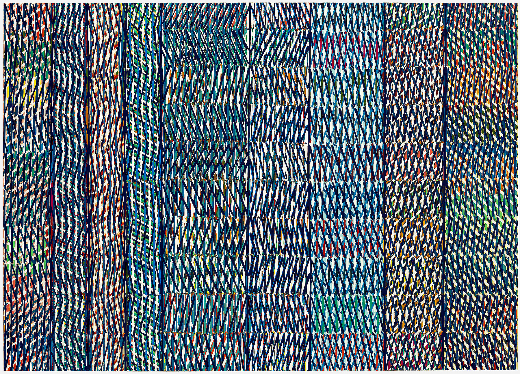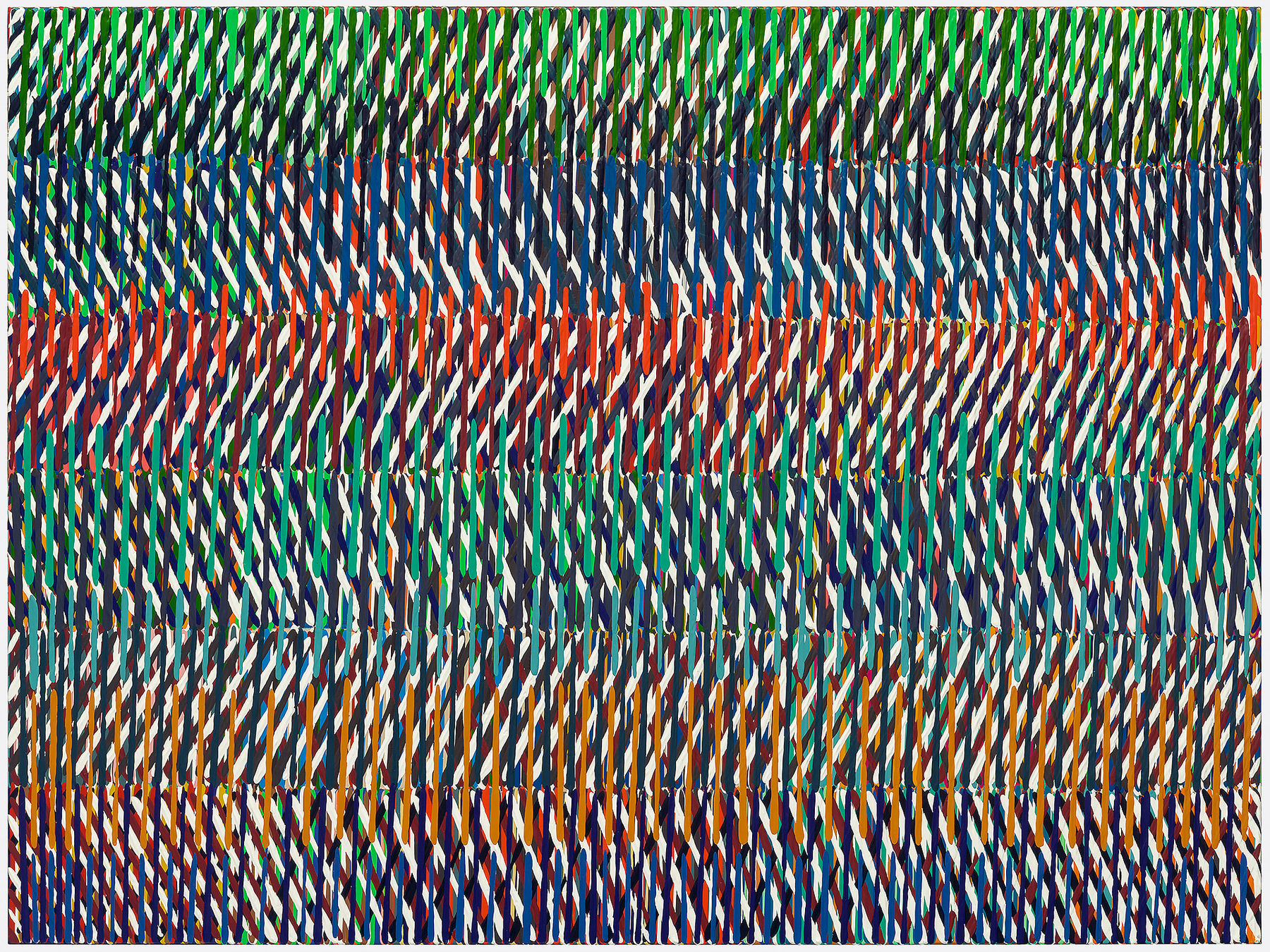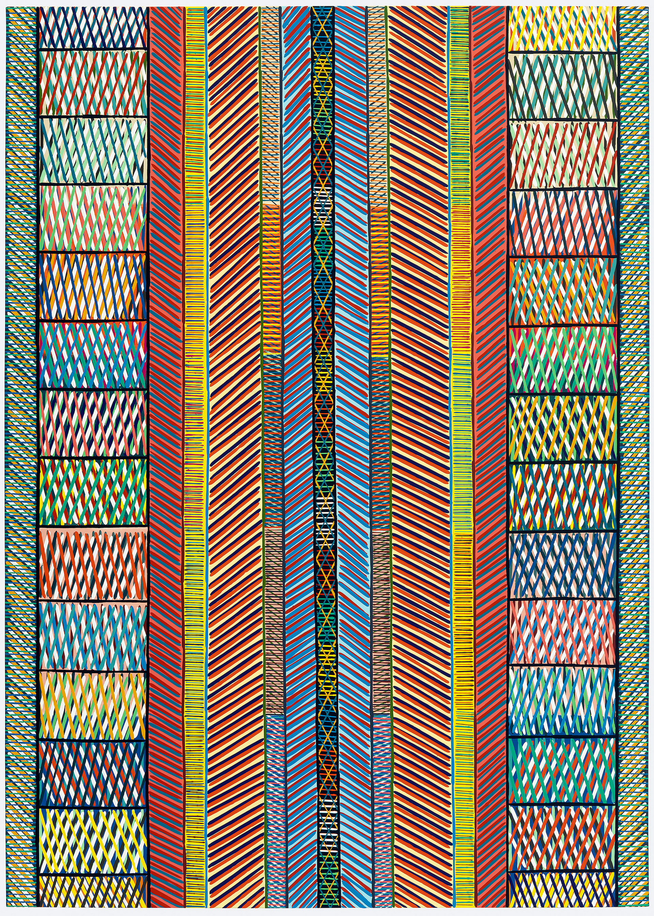 In these latest works, I employ humble organizing lines and signs not unlike tally and slash marks, hashtags and dashes that have been freed from their conformity in charts, ledgers, the Internet and written language. I use them instead to divide space, weave color and suggest densities of shadow, light, movement, weight, gravity, atmosphere and other aspects of our elemental world.