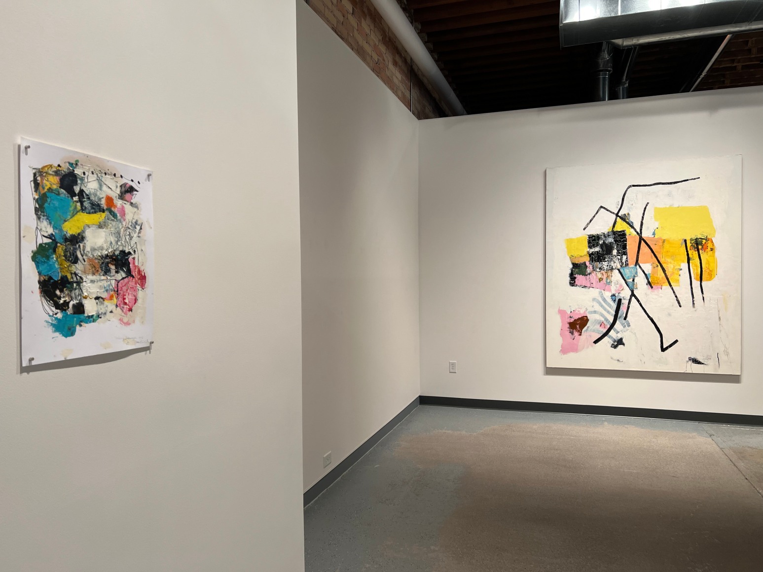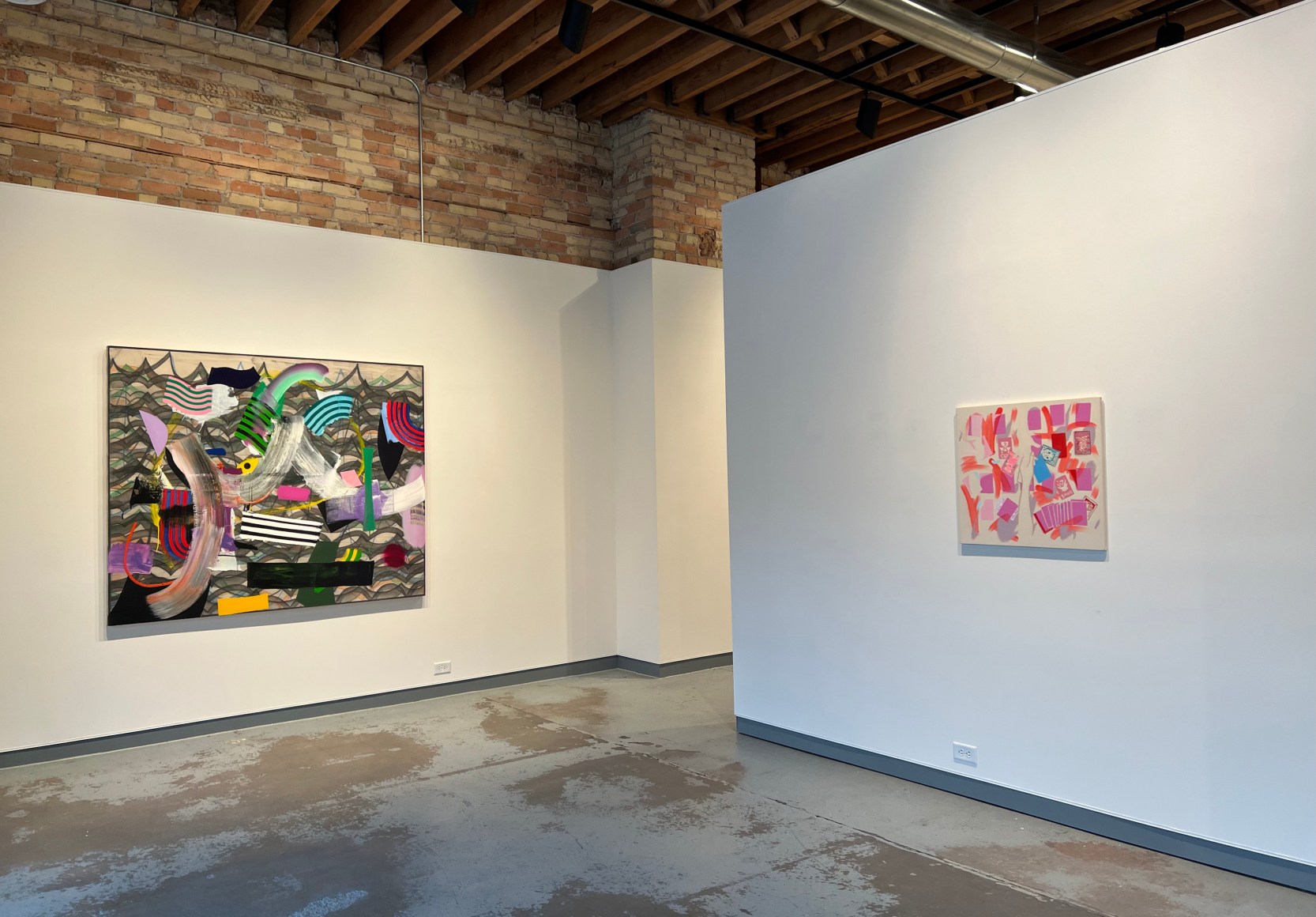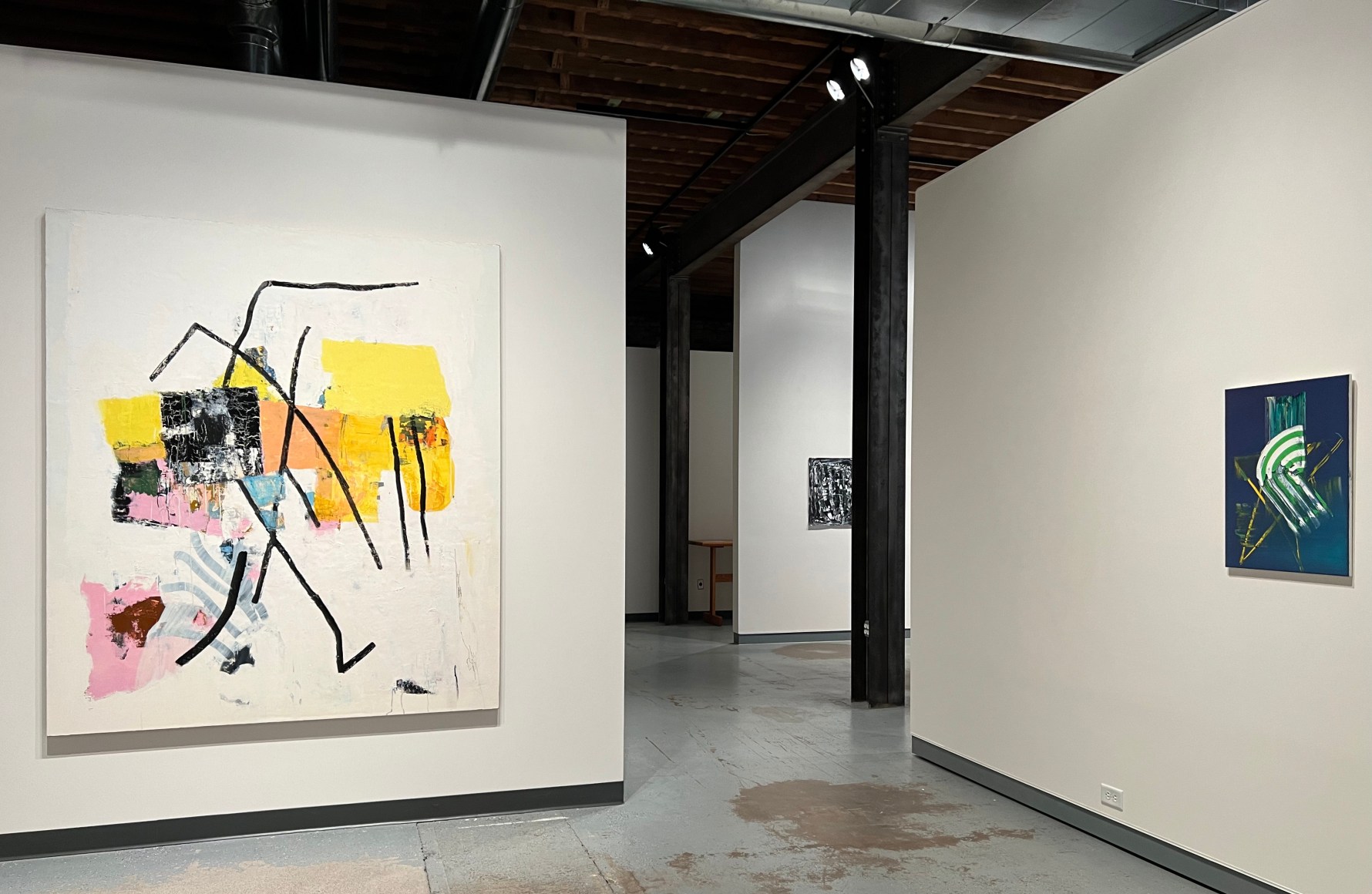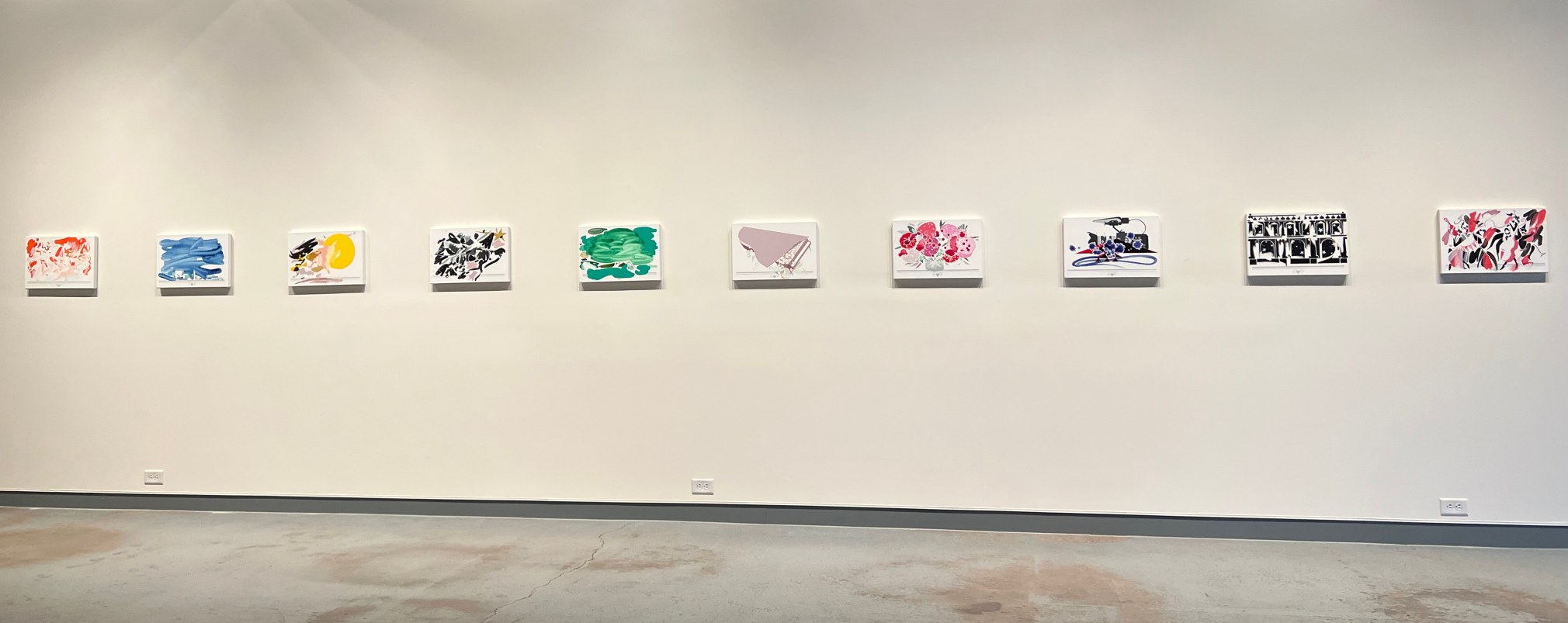 The featured artist of Distant Context is Peter Granados with ten small paintings in his “Daily Cards” series presented in a serial fashion along one long wall. These paintings share vibrant explosions of color and gestural abstraction with hints of an underlying narrative focused on the reality of “the present moment.”