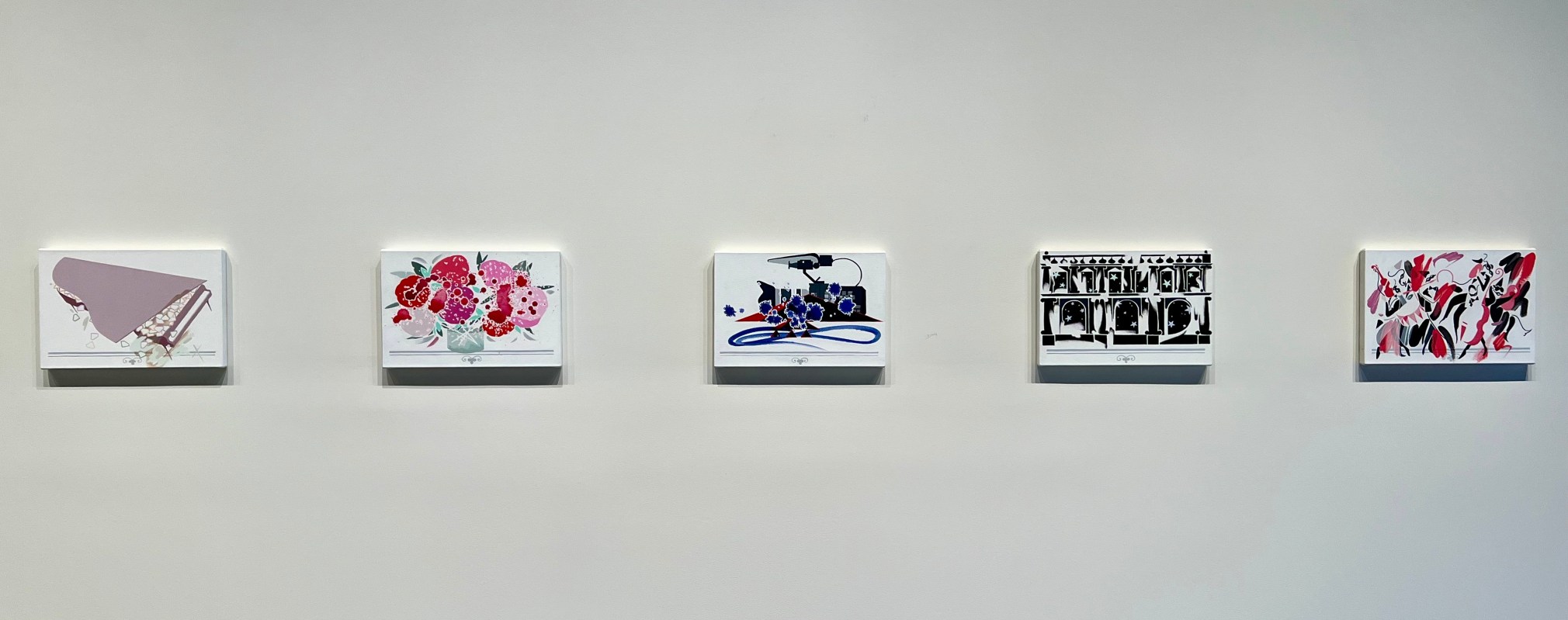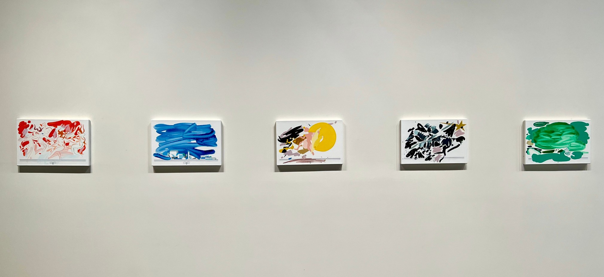 The artist has said these paintings draw from the daily inspirational cards that his parents collected from their spiritual teacher,