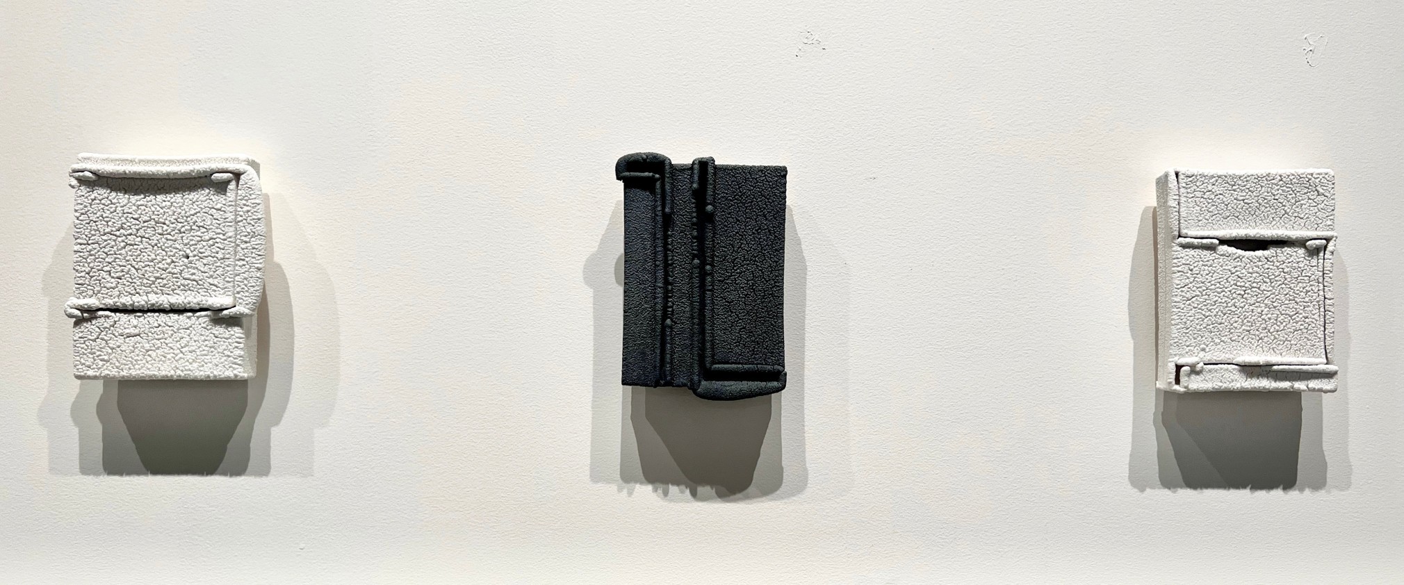 Esser’s wall-reliefs further explore her investigation into the fragile strength of surface textures – the outer “shield” that protects what is within. The wall-reliefs are made from liquid clay poured into flexible, grid-like molds. The flexibility of the mold encourages flaws to occur during firing. These purposeful flaws point to Esser’s excellent craftmanship – to create a ceramic sculpture that is both fragile and solid, “flawed” and whole, is a difficult endeavor. These sculptures also serve as reflections of our human and natural state, in which every shield has an imperfection, even if it is only that it is finite and will succumb to the entropy of time, eventually revealing what it protects. In Esser’s view it is this flaw that is “in the end of architecture, the end of the body, [the] inevitable succumbing to gravity, to decomposition, [that provides a] return to the earth, and … the prospect of growth and renewal.”