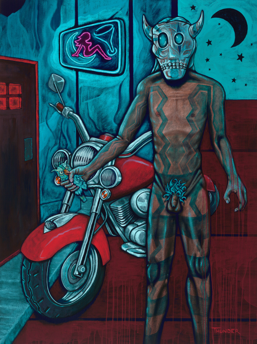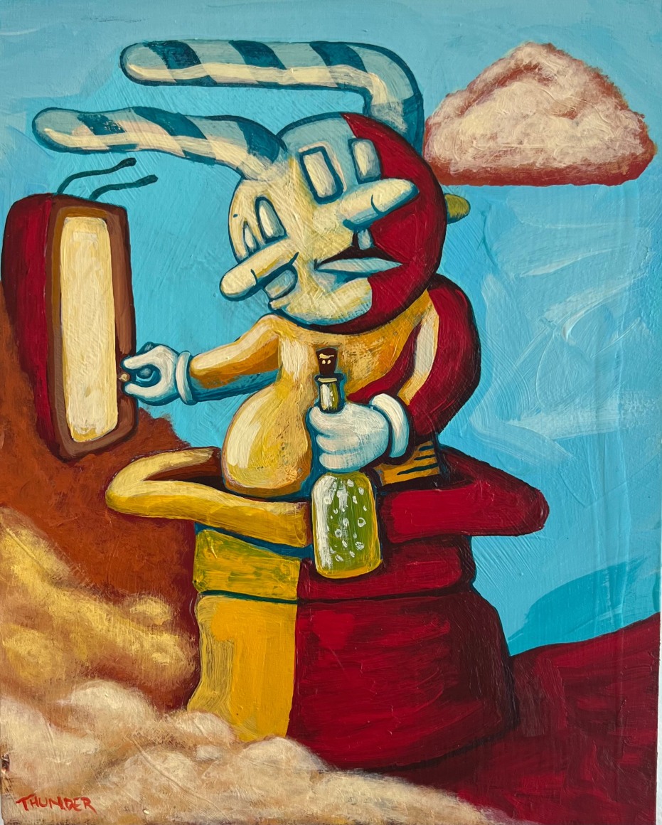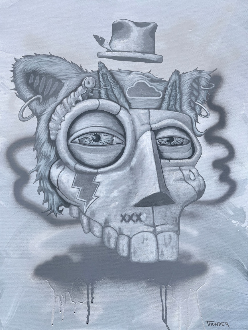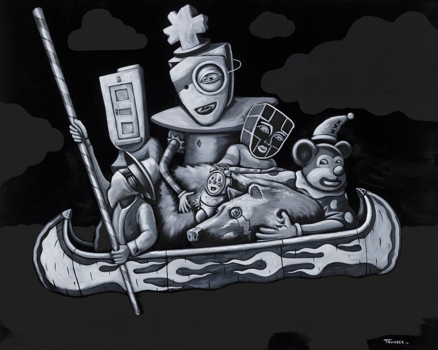 Thunder infuses his personal lens with real-time world experiences using a wide range of mediums. He is known for his surreal paintings, digitally animated films and installations in which he addresses subject matter of personal experience and social commentary. Jonathan is an enrolled member of the Red Lake Band of Ojibwe, and makes his home and studio in Duluth, MN.