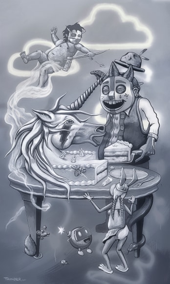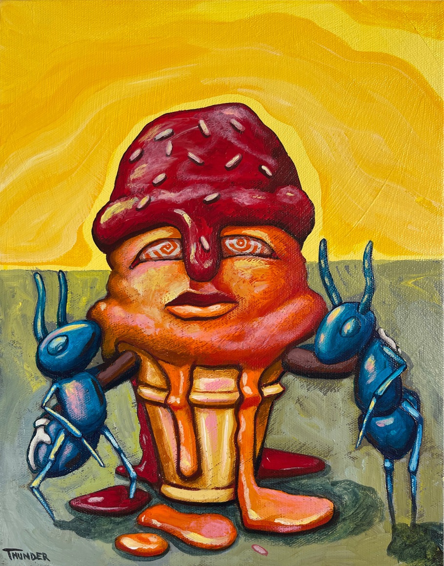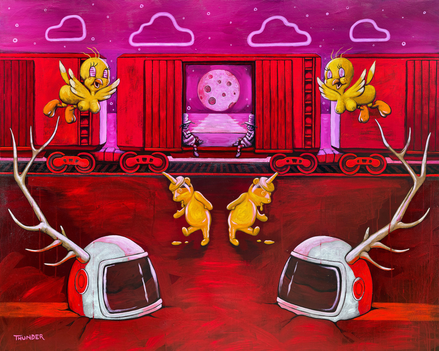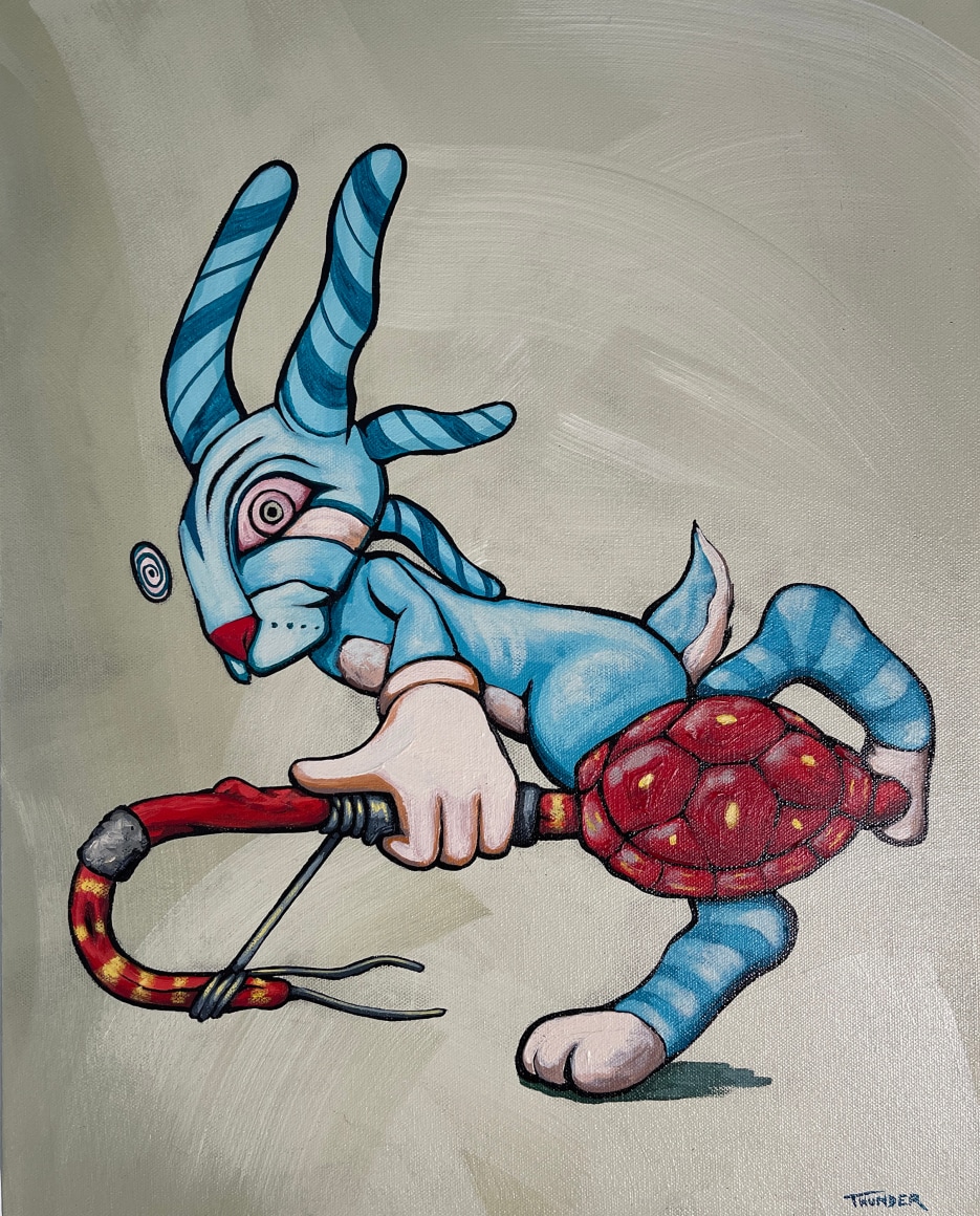 Thunder infuses his personal lens with real-time world experiences using a wide range of mediums. He is known for his surreal paintings, digitally animated films and installations in which he addresses subject matter of personal experience and social commentary. Jonathan is an enrolled member of the Red Lake Band of Ojibwe, and makes his home and studio in Duluth, MN.