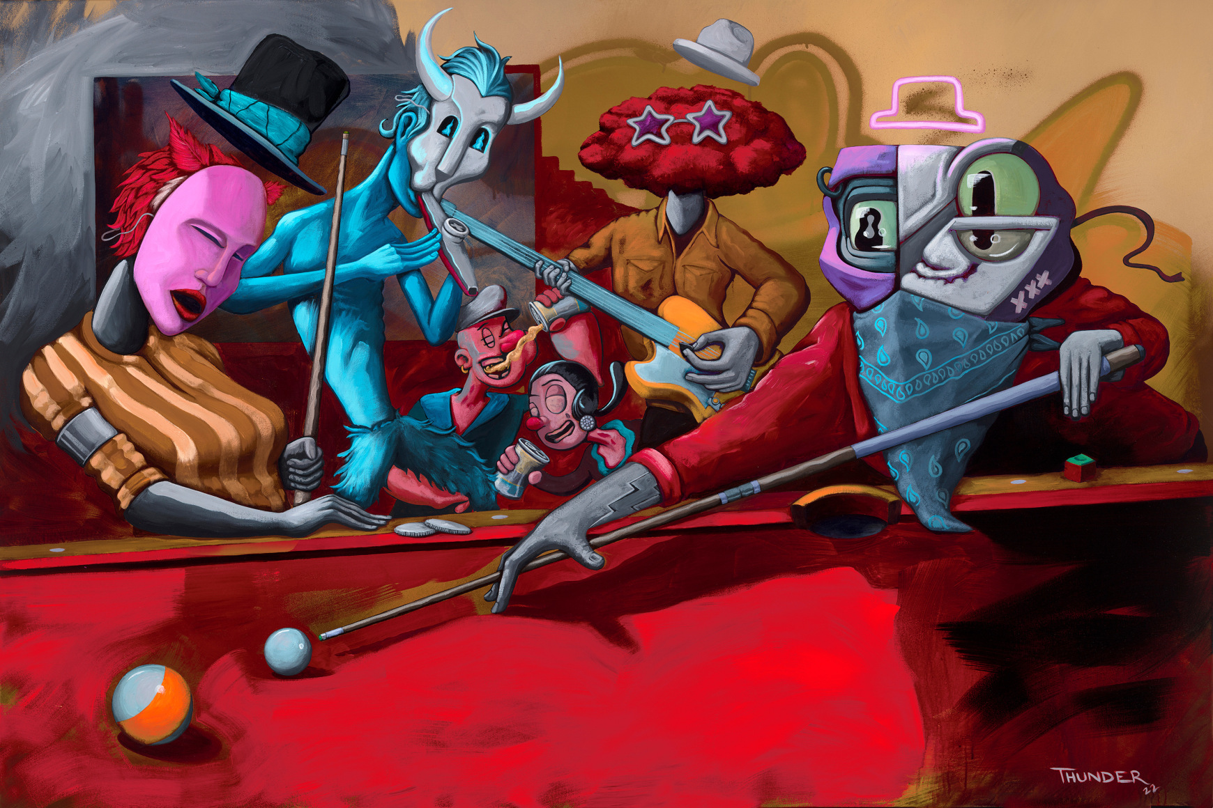 Using images that incorporate masks, humanistic animals and animalistic humans is how I discuss identity dynamics among subjects. When composing each work, I think from a storytelling standpoint and create a vignette. The Lighthouse captures what I observed in our society during 2020. I leaned on the historic painting Washington Crossing the Delaware for the composition and assigned roles to representational characters that I recognize from my own life. Another painting, Quarantine at Grandma’s House is a scene in which an extended family is living under the same roof during the first months of the Covid-19 pandemic. These works are composed of popular culture imagery from the Nintendo universe, classic tv shows like the Twilight Zone and modern tribal imagery. I’m also influenced by urban minutiae, bad graffiti, tattoos, tribal symbolism, children’s tales, and dreams.
